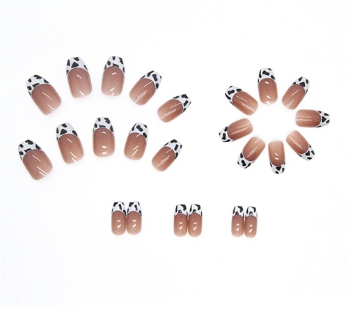 ピンクベージュをベースに、先端に太めフレンチデザインで牛柄が入っている人気の付け爪!