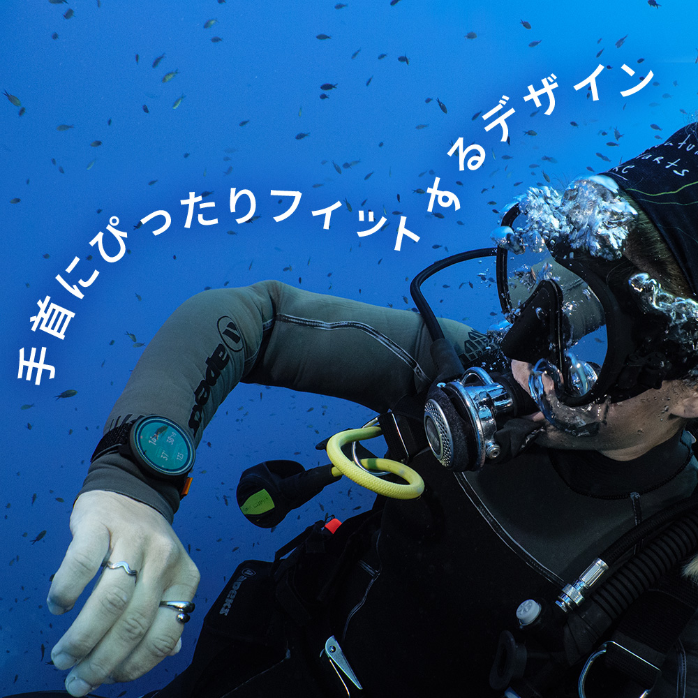 鮮やかで高輝度表示のAMOLEDカラーディスプレイを搭載し、水中でも重要なダイブデータが直感的に読み取れる視認性を実現しています。コンパクトかつ軽量設計で手首にフィットし、ウエットスーツやドライスーツにも対応する快適なエラスティックテキスタイルストラップを装備。