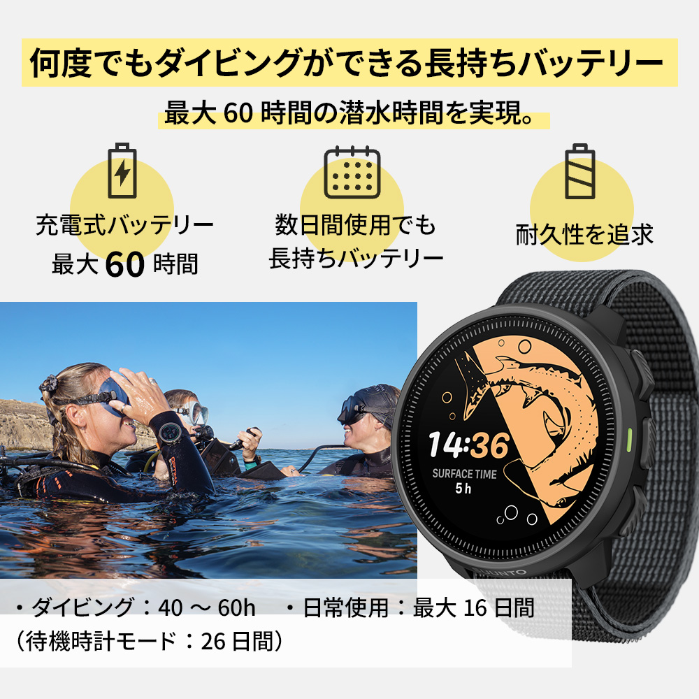 バッテリー駆動時間 ・ダイビングモード:80〜190時間(輝度設定により変動)