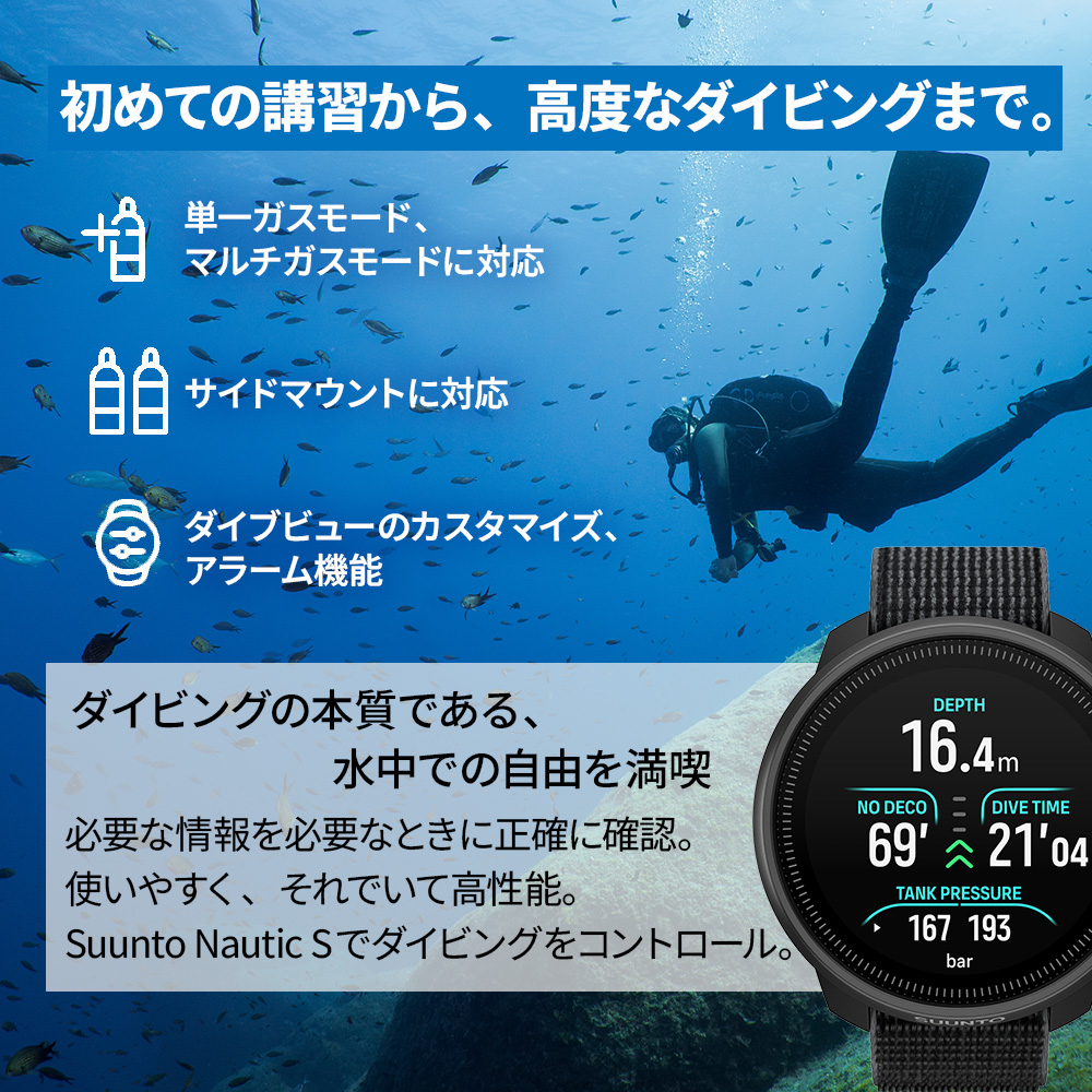 Suuntoが提案する最新のウォッチタイプダイブコンピューター「Suunto Nautic S」は、初心者から経験者まで幅広いダイバーをサポートする次世代モデルです。