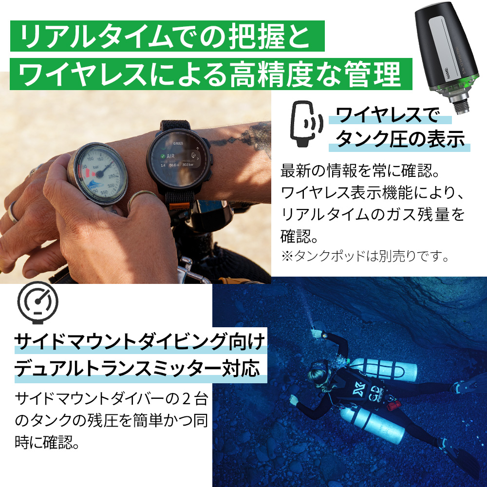 シングルガス・Nitrox・マルチガスモードに対応するほか、サイドマウント設定やカスタマイズ可能なダイブビュー、音声/振動アラームなどの便利機能を網羅。さらに、ワイヤレスタンク圧表示機能やデュアルトランスミッター対応で、リアルタイムのガス残量を手首から確認できます。