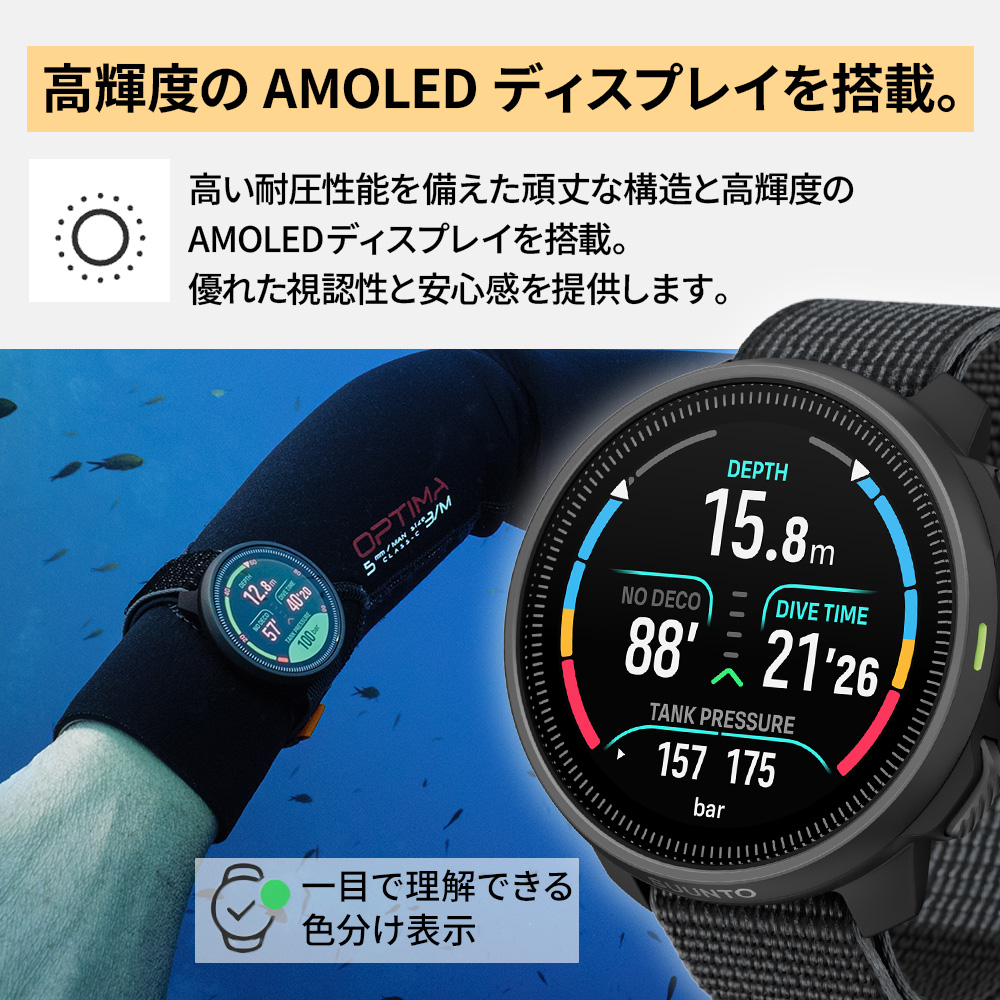 高輝度表示のAMOLEDカラーディスプレイを搭載し、水中でも重要なダイブデータが直感的に読み取れる視認性を実現しています。コンパクトかつ軽量設計で手首にフィットします。