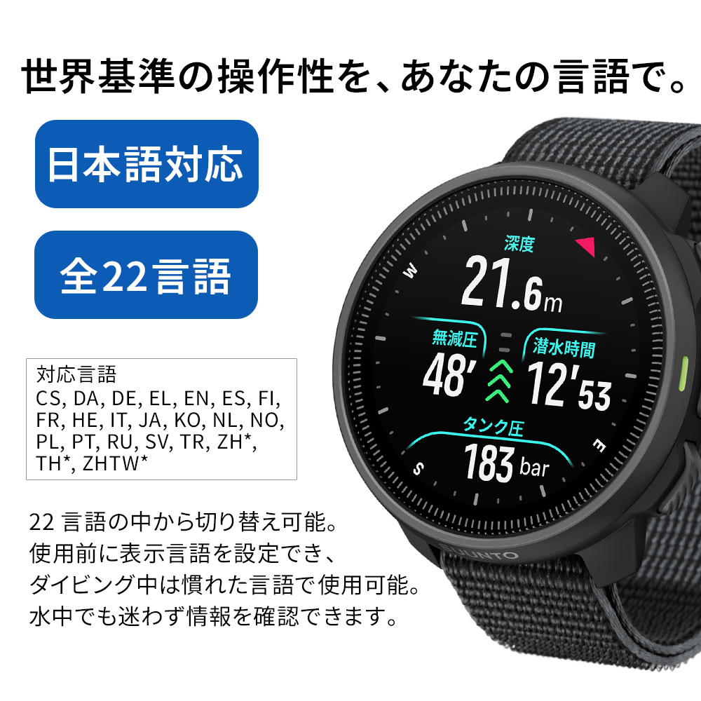 Suuntoアプリ連携でダイブログ管理や潜水ルート分析が可能となり、水中から陸上までダイブ体験をトータルでサポートします。フィンランド設計・製造の信頼性と直感的な操作性を両立し、あらゆるダイビングに最適なウォッチ型ダイブコンピューターです。