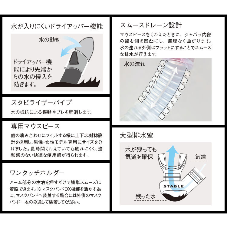 ≪この スノーケル について≫ GULL ガル ダイビング用スノーケル GS-3171B ■機能 ・気道を計算し設計したスノーケル 口元に大型排水室をもうけることで気道を確保し、スノーケルクリア後に水が残っても口内の水の逆流を防止します。 高い排水性能とストレスフリーの水面移動ができるスクーバダイビング・スキンダイビングに最適なスノーケル ■仕様 ・ドライアッパー ドライアッパー機能により先端からの水の侵入を防ぎます。 ・スタビライザーパイプ 整流効果を高めて水の抵抗を少なくした流線型フォルム。水の抵抗による振動や不快なブレを防止します。 ・18φ経口パイプ 快適な呼吸を確保できるよう考えられた口径で、無理なく安定した呼吸が確保できるパイプの太さを採用。 ・ワンタッチホルダー アーム部分の左右を押すだけで簡単スムーズに着脱できます。 ・スムースドレーン設計 水の流れる外側はフラットにすることでスムーズな排水が行えます。 ・専用マウスピース 歯の噛み合わせにフィットする様に上下非対称設計を採用。 ・交換式マウスピース ついスノーケル際に食いしばりちぎれてしまった場合や変色などの時でもマウスピースのみ交換が可能なので衛生的に保つことができます。 ・大型排水室 水が残っても気道を確保。口内への水の逆流を防止。 |
