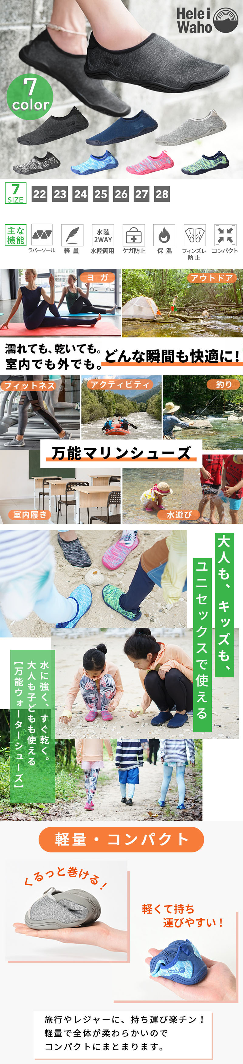 | 軽量感と通気性、乾きやすさを兼ね備えた水陸両用シューズ。海・川・プールはもちろん、旅行やキャンプ、タウンユースにも活躍します。 ●サイズ 22/23/24/25/26/27/28(cm) ●対象:ユニセックス(メンズ/レディース/) 【水に強く、すぐ乾く】 水はけ抜群!アウトソールのウォーターホール(水抜き穴)がシューズ内の水をスムーズに排出します。 ・濡れた後もムレにくく、海から移動しても快適 ・柔らかく搾れる素材で、水切りが簡単! ・乾きやすい構造で、連泊の旅行や合宿でも活躍 【通気性とフィット感】 素足感覚のフィット感。4WAYストレッチ素材が足にやさしくフィットし、長時間の使用でも快適です。 ・素足でも快適な通気性でムレを防止 ・履き口は柔らかく、擦れにくい仕上がり ・外反母趾にも優しい締め付け感の少ない設計 【歩きやすさと安心感】 滑りにくく、自然な歩行。天然ラバーソールが地面をしっかり捉え、岩場でも滑りにくい安心感。 ・足裏全体が柔軟に曲がり、素足感覚で歩行が可能 ・軽量で持ち運びやすく、コンパクトに収納できる ・ジムトレーニングやドライビングシューズにも 【デザインと快適さ】 日常使いもOK。スリッパ代わりの室内履きや、参観日の上履きとしても使えるシンプルデザインです。 ・締め付け感がなく、日常使いにもぴったり ・コンパクトで持ち運びやすく、タウンユースに ーさまざまなシーンで活躍ー 水辺のレジャーからタウンユースまで幅広くカバー。ファミリーシーンにもぴったりな汎用デザインです。 ・海水浴/川遊び/プール ・キャンプ/修学旅行/旅行 ・ファミリーシーン(水遊び、公園) ・フィットネス(ジム・ヨガ) ・ドライブ(ドライビングシューズとして) ・室内履き(携帯シューズとして) ●素材 ・アッパー: 4WAYストレッチ・スペーサーファブリック(約2mm) ・ソール: 天然ラバー(ウォーターホール〈水抜き穴〉機能付き) ●生産国:中国 |