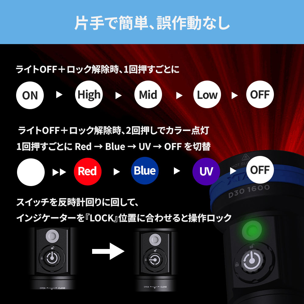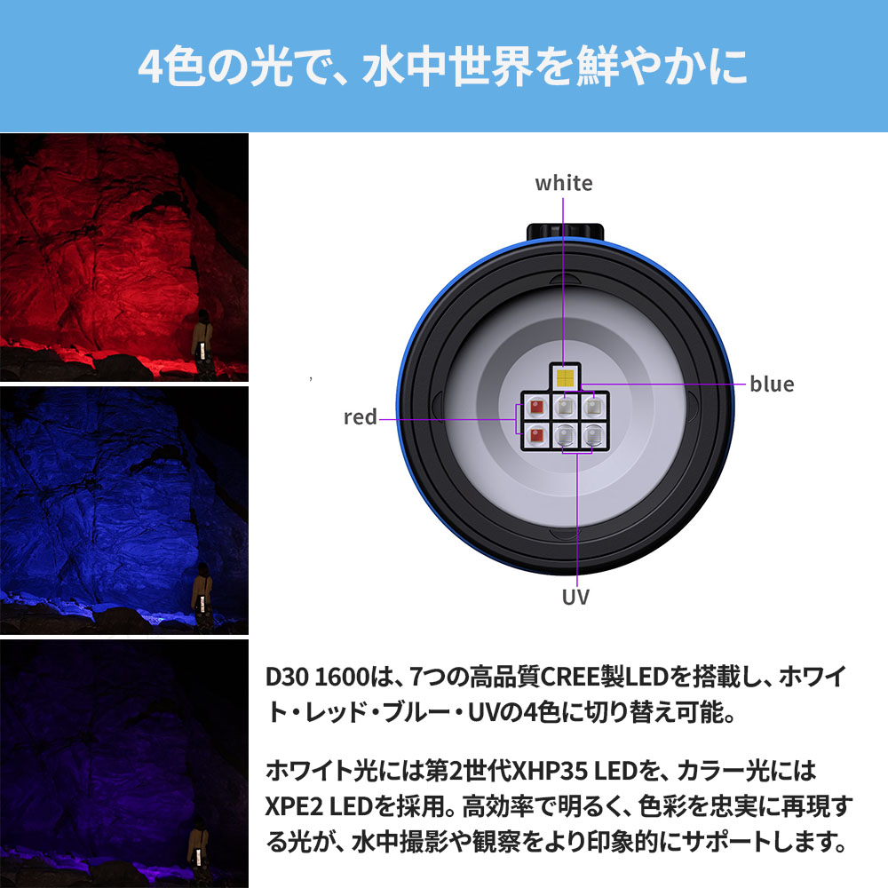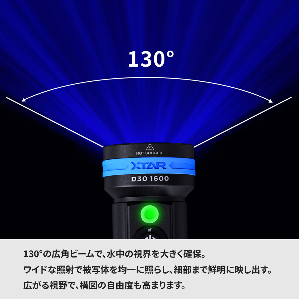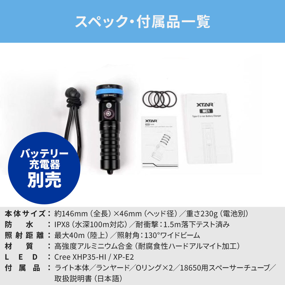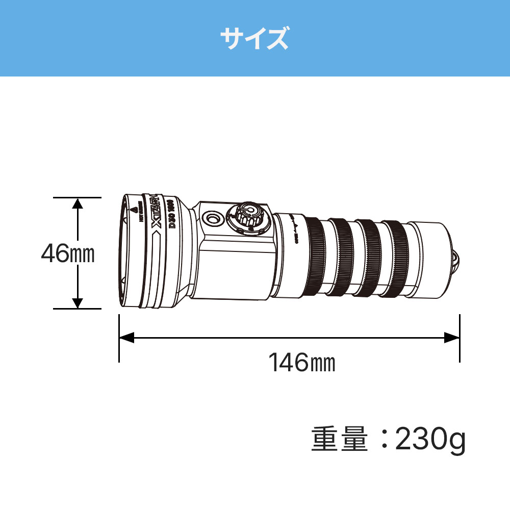 | D30 1600 (w/o BT, Charger) ブランド:XTAR (エクスター) ハイパフォーマンス・エレクトロニクスブランドで、リチウムイオン電池、充電器やLEDライトで広く知られてます。 スキューバダイビング業界では高性能なダイブライト(水中ライト / ダイビングライト/ 水中カメラ用ライト)のメーカーとしても注目され、日本国内ではVAPE(電子タバコ)用をはじめとする充電器・電池の品質と性能に定評があります。世界130カ国以上で実績を持ち、当社は正規代理店として販売しています。 < 本体サイズ > (先端直径 )46mm / (底直径 )33mm 全長:146mm < 重量 > 230g (バッテリー含まず ) < 材質 > 高強度アルミニウム合金 (耐腐食性に優れたハードアルマイト加工 ) < 最大光量 (ルーメン ) > White High:1600ルーメン White Mid :800ルーメン White Low :400ルーメン Red :260ルーメン Blue:130ルーメン UV :6W < 連続点灯時間 > White High:約2時間 White Mid :約3時間 White Low :約6時間 Red/Blue/UV:約3時間 ※ 26650 リチウムイオン電池 (5200mAh ) 使用時 < 照射距離 > 最大40m (陸上 ) < 照射角 > 130° (ワイドビーム ) < 耐圧深度 > 水深100m (IPX8等級 ) ※水中では、浮遊物などによる透明度によって短くなります。 < 耐衝撃性 > 1.5mまでの落下テスト済み < LED > Cree XHP35-HI / XP-E2 < 演色性 (CRI ) > 95+ < 対応電池 > ※別売り ・3.6V 26650 Li-ion 5200mAh / リチウムイオン電池 ・3.6V 18650 Li-ion 3500mAh / リチウムイオン電池 (アダプター/スペーサー: 付属 が必要) ※必ず、XTAR のバッテリーをご使用ください。 ※当社が取扱うXTARリチウムイオン電池は全てPSE取得済。 < スイッチ方式 > マグネット式プッシュボタン (ロック機能付き ) < 付属品 > 水中ライト 本体 / ランヤード / スペアOリング(2個) / 18650 Li-ion電池用スペーサーチューブ / 取扱説明書 (日本語表記あり) ※電池、充電器(チャージャー)は別売りとなります。 < 製品保証 > ・ライト:ご購入後2年間 ※初期不良や説明書に記載の内容のご対応となります。 < 正規製品証明 > パッケージに記載されている偽造防止ラベルのコーティングを削り、18桁の偽造防止コードを取得します。取得したコードは、説明書記載の手順に従って正規品の確認が可能です。 |