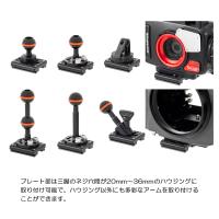 プレート部は三脚のネジ穴間が20mm〜36mmのハウジングに取り付け可能で、ハウジング以外にも多彩なアームを取り付ける事が出来ます。