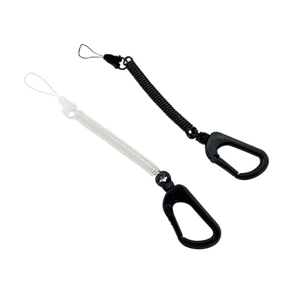 ■特徴 携帯電話はもちろんのことカッターやキーなどをなくさないように装着してもOKです。 ■仕様 回転式カラビナクリップでコイルが絡まない。 【入数】 1点 ASS16BK