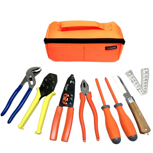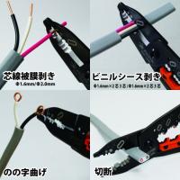 セット内容:電工VAストリッパ(φ1.6×2芯・3芯/φ2.0×2芯・3芯用)、圧着工具(リングスリーブ(E)用 適用範囲1.6×2小・小・中)、ペンチ175mm、ウォーターポンププライヤ200mm、ドライバー?No.2 100mm/?5.5 100mm、電工ナイフ、テープメジャー 1.5m、ツールケース