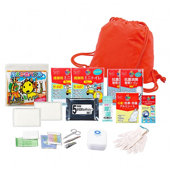 セット内容:(1)小さめde巾着リュック、(2)(3)抗菌消臭・簡易トイレ×2、(4)(5)携帯用ミニトイレ×2、(6)おえかきパズル、(7)新ソーラー&ダイナモLEDライト(3色アソート)、(8)4層!アルミシート、(9)除菌ジェル、(10)防災用ウェットティッシュ(20枚入)、(11)(12)ポケットティッシュ×2、(13)純綿こども軍手、(14)絆創膏5枚、(15)綿棒10P、(16)コットンパフ3枚、(17)ワンタッチ包帯、(18)爪切り、(19)毛抜き、(20)ハサミ
