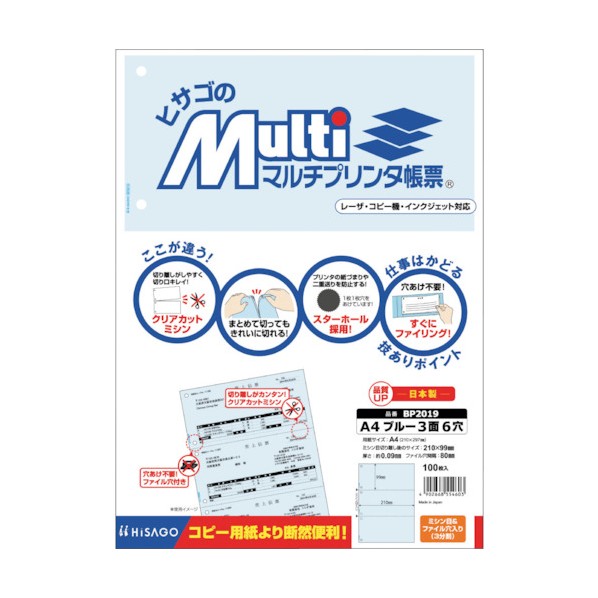 ヒサゴ マルチプリンタ帳票 A4 ブルー 3面 6穴 BP2019 1点