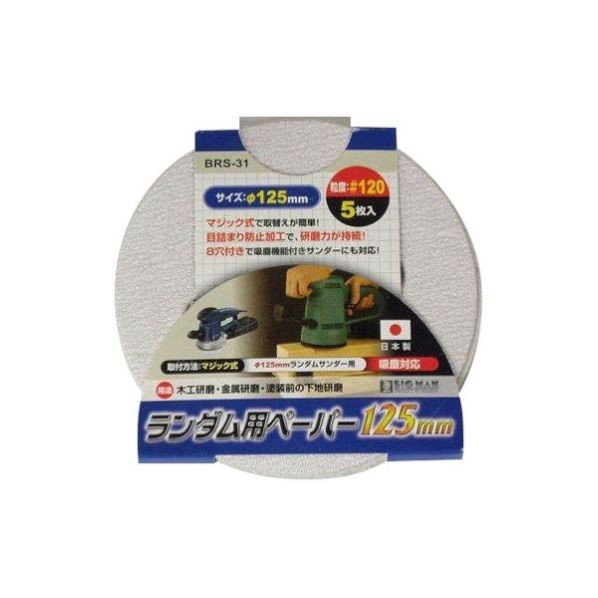 【特長】 ●マジック式で取り換えが簡単。 ●目詰まり防止加工で、研磨力が持続。 ●8穴付で吸塵機能付きサンダーにも対応。 【用途】 木工研磨、金属研磨、塗装前の下地研磨。 【仕様】 ・直径:125mm ・粒度:#120 ・入数:5枚 ・取付対象工具:ランダムサンダー ・取付方法:マジック式 ・本体サイズ:125×125×10mm ・パッケージサイズ:150×110×10mm ・重量:34g ・製造国:日本 【サイズ】 #120 【入数】 5枚 BRS31