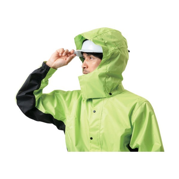 取り外し可能なヘルメット対応フードを装備したレインスーツです。