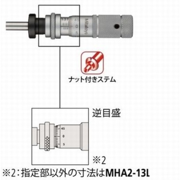 ●ステム形状:ナット付/クランプ付 ●先端形状:平面逆目盛 ●測定範囲13mmの小形・汎用タイプです。 ●シンブルでの基点調整が簡単にできます。 ■共通仕様 ●測定範囲 0〜13mm ●目量 0.01mm ●器差 ±2?m ●測定面材質:合金工具鋼 (MHA-13Sはステンレス鋼) 硬度:60HRC以上 (MHA-13Sは50HRC以上) ●目盛部表面処理:硬質クロムメッキ (MHA-13Sは表面処理なし)