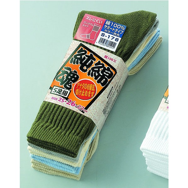 ●綿100%靴下 ●汗を吸収しやすく、肌さわりが良い ●材質:綿100% ●サイズ:25~27cm 【カラー】 カラー 【入数】 5P S176
