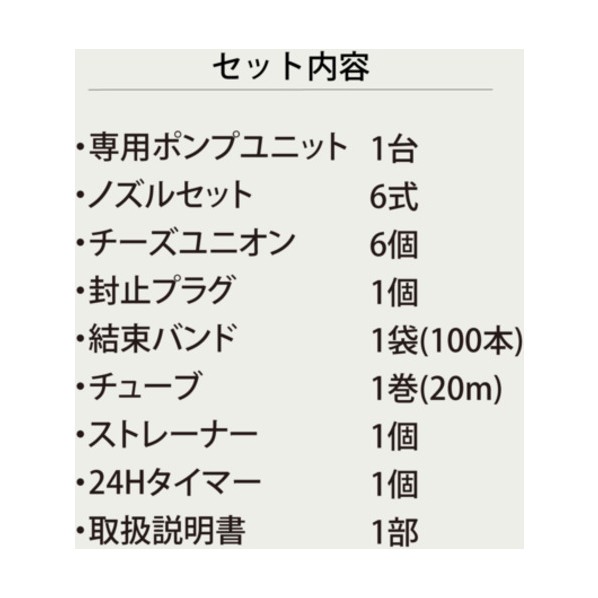 ■特徴 水道・電源がなくても、市販のタンクなどの貯水容器や小型ポータブル電源を用意すれば簡単にミストを生成することができます。 ■用途 運動場・校庭、園庭・庭、ベランダ、屋外休憩場、遊園施設などのミスト冷房様。 ■仕様 ノズル1個あたりの水量 5.1L/h(0.4MPa時) ■セット内容 お手軽ミストポンプ1台、コンセントタイマー、ノズルセット+チーズユニオン6個、閉止プラグ、結束バンド(全長152mm)100本、ナイロンチューブ20m、ストレーナー、取扱説明書 ■注意 ・本製品は上水道でご使用ください。 【重量】 2KG 【原産国】 日本製 MISTPUMPSMNOZZLESET6