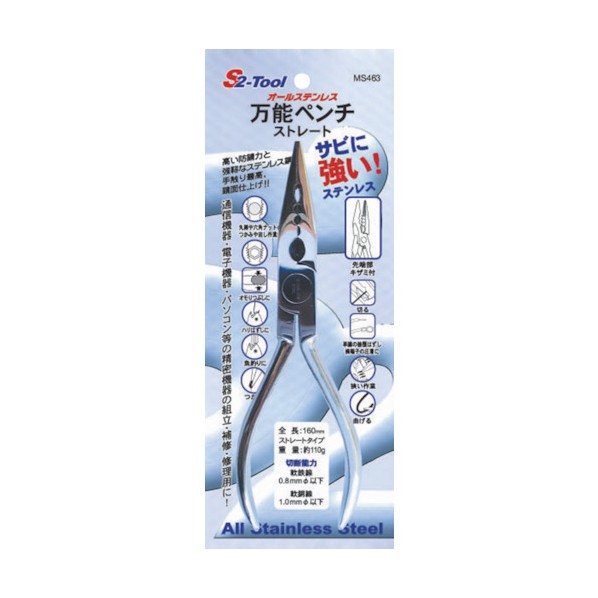 ■特徴 さびに強いオールステンレス製です。 手触り最高、総研磨仕上げです。 ■用途 通信機器、電子機器、精密機器、パソコンなどの組立、補修、修理やプロホビー、装飾品関係、模型製作、また釣り用のフィッシングペンチとして。 ●全長(mm):160 ●タイプ:ストレート、刃先ギザ付き 【材質】●ステンレス 【入数】 1 【原産国】 パキスタン MS463