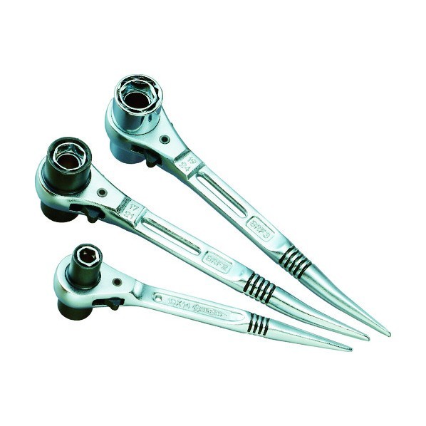 1丁で4サイズの六角対辺に対応した、シノ付ラチェットレンチです。