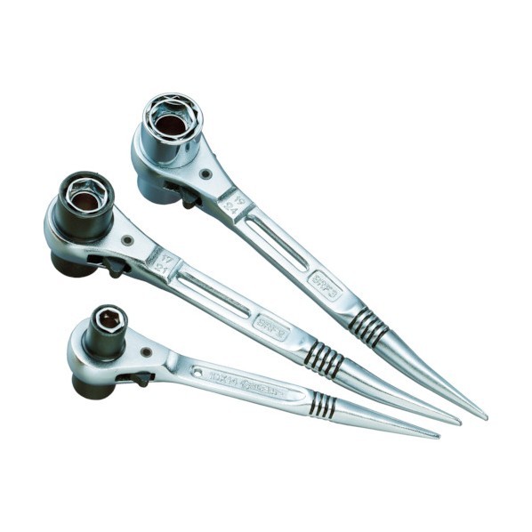 1丁で4サイズの六角対辺に対応した、シノ付ラチェットレンチです。
