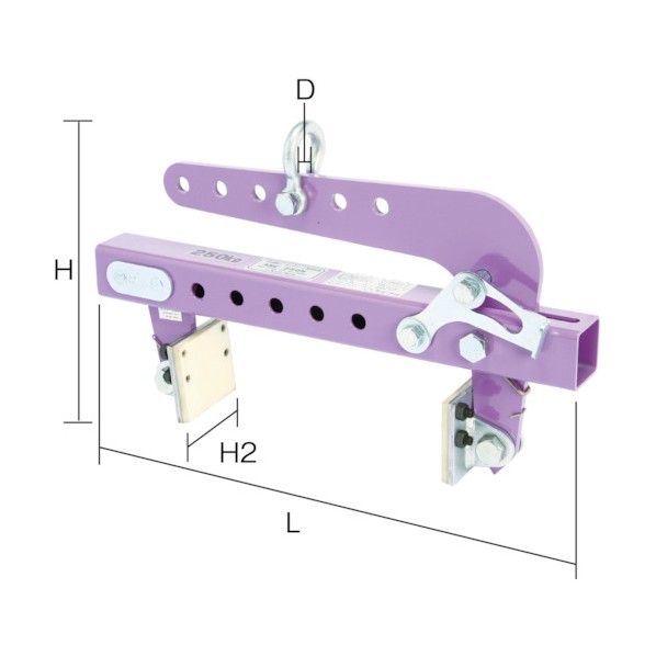 ■特徴 シャックルを重心位置に合わせることにより、ワークをバランスよく吊り上げることができます。 本体内蔵のばねにより、パッドは常にワークに密着し、安定した吊り上げ状態を保持します。 手動で開放ロックがかかり、吊り具の取り外しがスムーズです。 爪位置を変えることにより、広いクランプ範囲に対応しています。 特殊ゴム製パッドにはスパイク機構を採用し、吊り荷を確実にクランプします。 ■用途 歩車道境界ブロック、小型L壁などの吊り上げ作業。 ■仕様 パッド式 ■材質 一般構造用圧延鋼材 ■注意点 シャックルの位置により使用荷重が変わります。 ●基本使用荷重(t):0.25 ●クランプ範囲(mm):10〜240 ●寸法(mm)L:460 ●寸法(mm)H:270〜420 ●寸法(mm)D:30 ●寸法(mm)H2:80 ●パッド式 【重量】 5.500KG 【入数】 1点 【原産国】 日本 AMC250N
