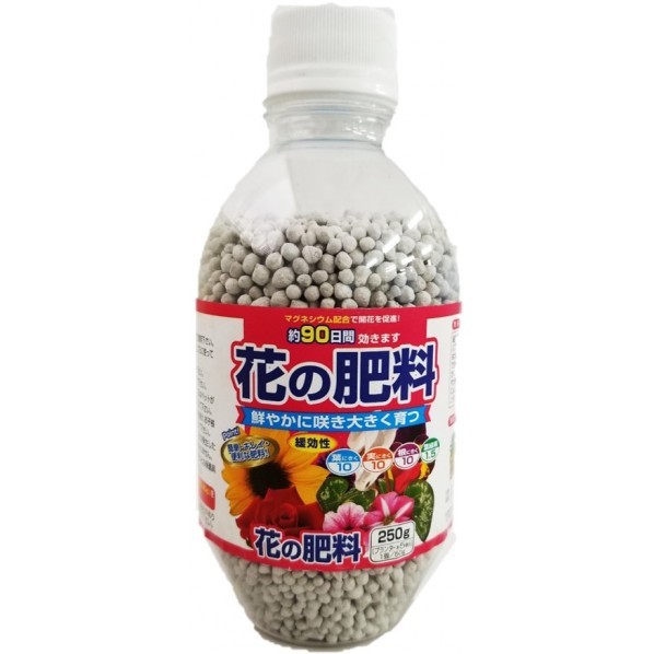 マグネシウム配合でリンサンの吸収をアップし、光合成を盛んにして開花を促進します。 ニオイが少なく室内でも使用できます。 緩効性の化成肥料です。 成分量 チッソ:10 リンサン:10 カリ:10 マグネシウム:1.5