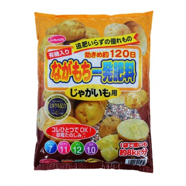 追肥いらずの優れもの! 硫黄でコーティングされた窒素肥料を使用しておりますので、長く効き続け追肥が必要ありません。 追肥の施しにくいマルチ栽培にも最適です。 目安として 肥料500gで種いも約2kg分 2kgで種いも約8kg分です。 成分量 チッソ:7 リンサン:11 カリ:12マグネシウム:1