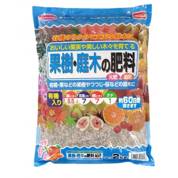 柑橘類や柿などの果樹や、桜やつつじなどの花木・庭木により適した肥料です。 有機物も含まれ、土壌が豊かになり、木々は健康に果実は美味しく育ちます。 【入数】 1個 2kg