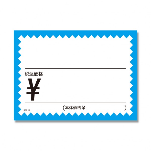 ギザギザの枠が目を引くプライスカードです。 税込み価格の表示に。 【サイズ】 95×130mm 【カラー】 水 【入数】 50枚 007223616