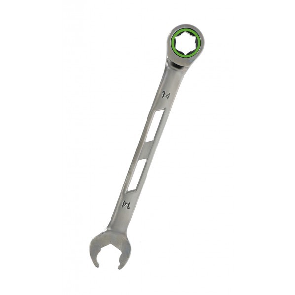 ●ギア数120山 ●本締め可能 ●摩耗したボルト・ナットも回せる ●連続作業が可能なクイックタイプ メーカー名:高儀 【サイズ】 14mm 【重量】 112g 【入数】 1本