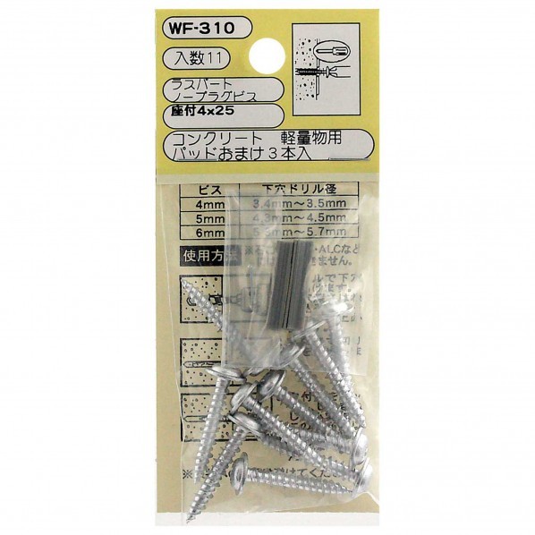 【商品説明】 軽量物用のラスパートノープラグビスです。 コンクリートへの器材の取り付けの際に使用します。 【注意】 石こうボード・ALCなどには使用できません。 天井への使用は避けてください。 下穴ドリル径(mm):3.4〜3.5 【付属品】 パッドおまけ3本入り下穴ドリル径:3.4〜3.5mm 【サイズ】 座付4X25mm 【付属品】 パッドおまけ3本入り 【入数】 11本 WF310