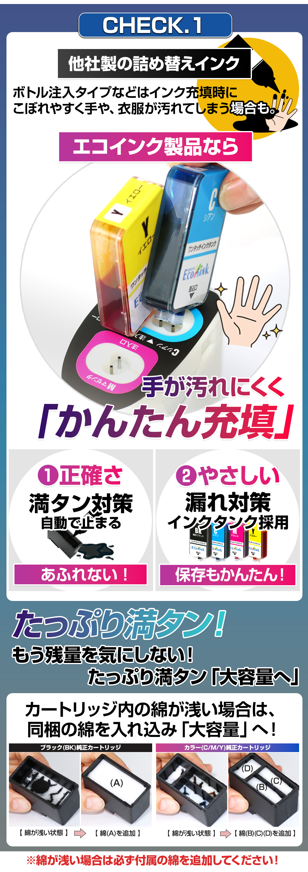 | ※純正カートリッジが空になってから詰め替えてください。 ■PCやプリンターの表示が【インクがなくなりました。/ インク残量が正しく検知できません。】になった時が交換のタイミングです。 △PCやプリンターの表示が【インクが少なくなっています。】の場合は、詰替えの時期ではございません。必ず【インクがなくなりました/ インク残量が正しく検知できません。】になった際に詰替えをお願いいたします。 |