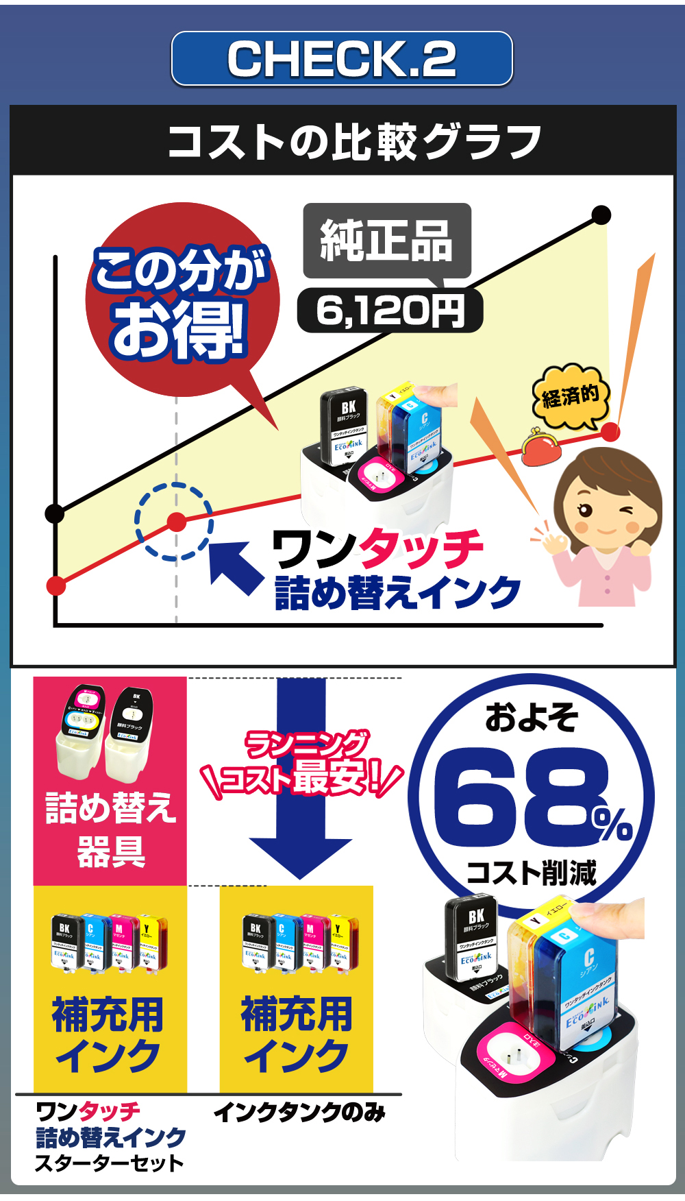 | ◆空になった純正カートリッジ (BC-365+366 / BC-345+346 / BC-310+311用)にインクを詰め替えて使用します。 (1)純正カートリッジのフタを外し、付属の専用/注入用フタを取り付けます。 (2)注入用ホルダー(下)の中に(1)の純正カートリッジを入れます。 (3)注入用ホルダー(上)を取り付けます。 (4)ワンタッチインクタンクを、指定のカラー位置の注入口に差し込みます。 (5)インクの充填が終わったら、注入用ホルダーから純正カートリッジを取り出します。 (6)インクを詰め替えた純正カートリッジを専用/注入用フタを取り付けたままプリンターにセットします。 (7)インク残量検出機能の無効化を設定します。 >>印刷が出来るようになります。 |