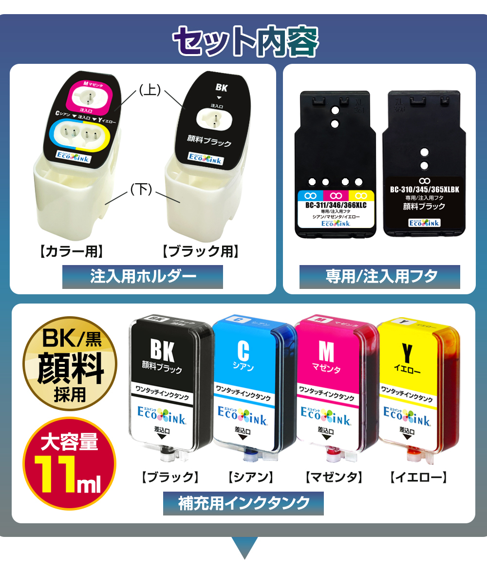| BC-365+366 / BC-345+346 / BC-310+311 詰め替え用インク■x1, ■x1, ■x1, ■x1 注入用ホルダー(上 / 下)、専用/注入用フタ(ブラック用 / カラー用) 、補充用パット1セット、手袋、ペンチ(工具)、型番ラベル、説明書 |