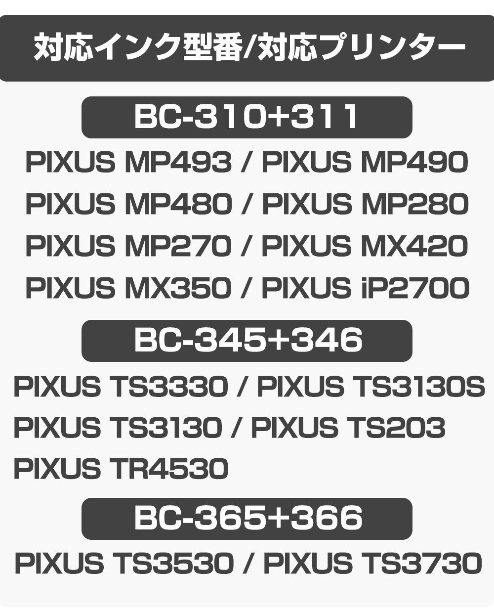 | ◆BC-365+366 対応プリンター◆ ・PIXUS TS3530 ・PIXUS TS3730 ◆BC-345+346 対応プリンター◆ ・PIXUS TS3330 ・PIXUS TS3130S ・PIXUS TS3130 ・PIXUS TS203 ・PIXUS TR4530 ◆BC-310+311 対応プリンター◆ ・PIXUS MP493 ・PIXUS MP490 ・PIXUS MP480 ・PIXUS MP280 ・PIXUS MP270 ・PIXUS MX420 ・PIXUS MX350 ・PIXUS iP2700 |