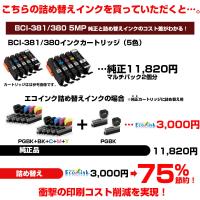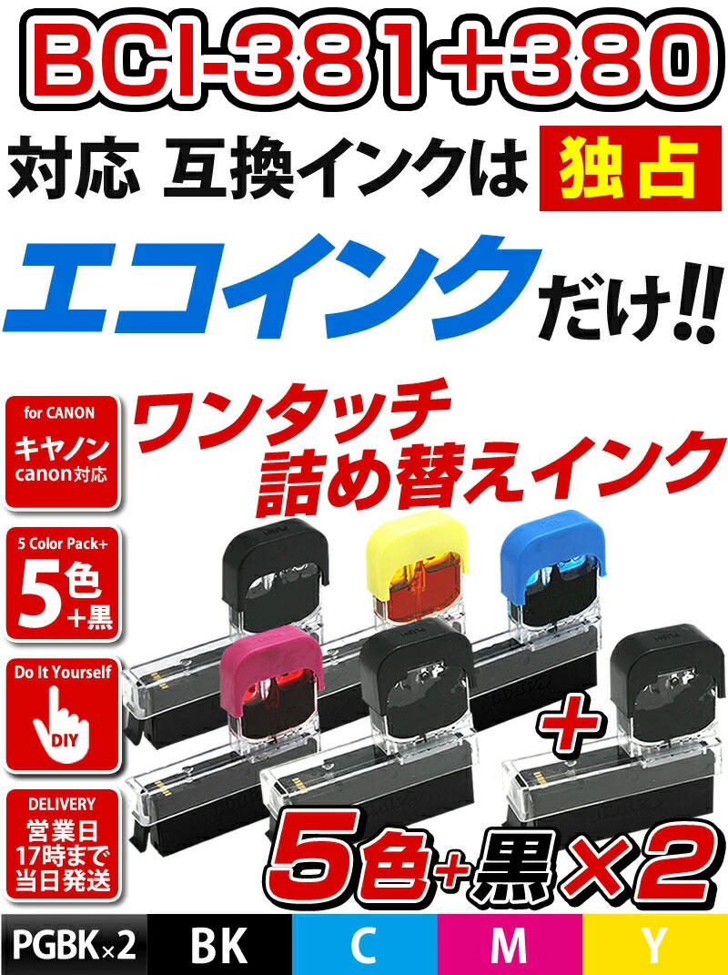 | お手持ちのプリンター型番と照らし合わせてお探しください。 | | ・PIXUS TS8430 | ・PIXUS TS8330 | ・PIXUS TS8230 | | ・PIXUS TS8130 | ・PIXUS TS7430 | ・PIXUS TS7330 | | ・PIXUS TS6330 | ・PIXUS TS6230 | ・PIXUS TS6130 | | ・TR9530 | ・TR8630a | ・TR8630 | | ・PIXUS TR8530 | ・PIXUS TR7530 | ・TR703a | | ・TR703 | | | | | | | インク型番 | BCI-380PGBK BCI-381BK BCI-381C BCI-381M BCI-381Y | | インク成分 | BCI-380 顔料 BCI-381 染料 | | セット内容 | 詰め替えインク5色パック×2 (PGBK/BK/C/M/Y)×2 +PGBKおまけ2個 | ・詰替えタイプの商品です。空になった純正カートリッジにインクを補充して使用します。 ・S、XL表記のカートリッジにも対応しています。 ・純正カートリッジの状態(内部綿の劣化による硬化状態)によってはインクが出ない、出にくい場合があります。 ・説明書ページ記載の改善策をお試しください。改善されない場合は、新しい純正カートリッジをご用意ください。 ・純正カートリッジの劣化による不具合は、弊社の1年保障に該当いたしません。予めご了承ください。 | | インク残量表示 | インクを詰め替えて使用する場合、正しいインク残量は表示できなくなります。 | | 取扱方法 | 手順説明をよくお読みの上でご購入下さい。 | |