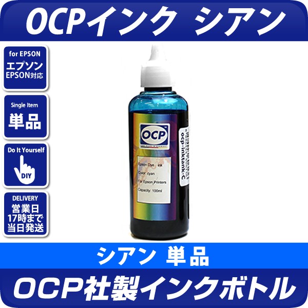 【対応プリンター】エプソンプリンター対応【インク成分】染料インク【セット内容】OCP社製インクタンク シアン■(100ml)×1【商品の特性】・汎用の詰め換えインクタンクです。エプソン6色プリンターインクに対応しています。・純正品インクカートリッジや互換インクカートリッジにインクを詰め替える際に使用してください。・詰め替え方法はお客様自身にてご確認ください。そのため、詰め換えインク上級者向けの製品となります。・ドイツOCP社の高品質染料インクを採用しています。【取扱い方法】・詰め替え方法はお客様自身にてご確認ください。そのため、詰め換えインク上級者向けの製品となります。