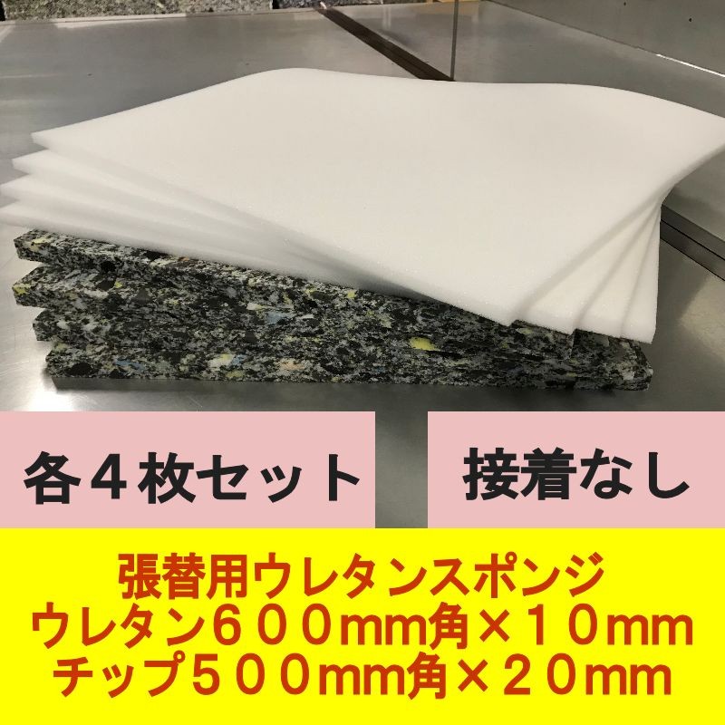 日本製 チップウレタン500mm角×20mm厚 ウレタン600mm角×10mm厚 接着なし 4組セット 椅子張替やシートクッション交換用ウレタンスポンジ
