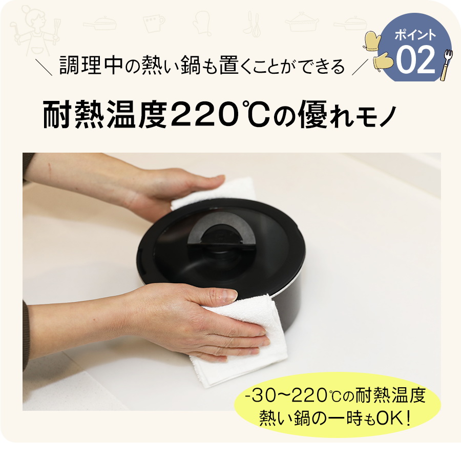 【耐熱温度220℃で熱をブロック】調理中の熱い鍋も置くことができる220℃の耐熱性の優れモノ。