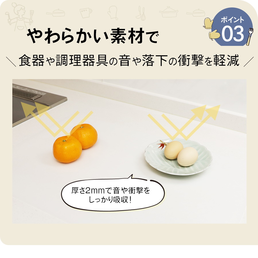 【音や衝撃を吸収】やわらかい素材で食器や調理器具の音や落下の衝撃を軽減。