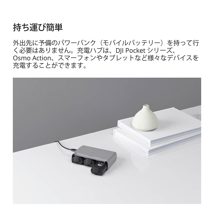 *DJI 18W USB 充電器を使用して制御された環境下(室温25℃)で測定した場合。このデータはあくまで参考地で、充電電力/充電ケーブル/温度などの要因に依存し、影響を受けます。