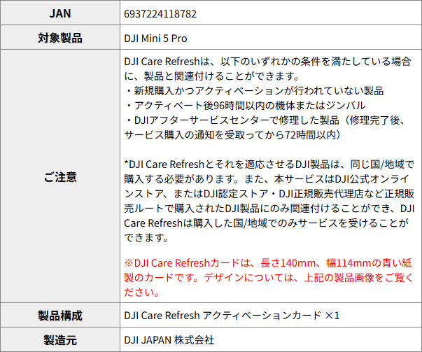 ※DJI Care Refreshカードは、長さ140mm、幅114mmの青い紙製のカードです。デザインについては、製品画像をご覧ください。