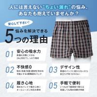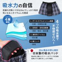 【まるで普通のトランクス】 目立たない自然な見た目で普段使いに。吸水機能付きとは思えない自然な形状。前から見ても横から見ても、普通のトランクスと変わらない見た目です。スーツや普段着にも響きにくく、外出や通勤でも気兼ねなく着用が可能です。吸水パンツに見られたくない、という方に安心のデザインです。 【しっかり吸収、漏れを防ぐ安心設計】 給水量20cc・漏れ対策・日本製吸水パッド採用。尿漏れ対策に十分な吸水力で、20ccの水分をしっかりキャッチ。急な“ちょい漏れ”でも安心。吸水性に優れた日本製パッド「クリーンオアシス」が、漏れを防ぎ、逆戻りも抑えます。長時間でも安心できる設計で、外出時や夜間にも最適。吸水パッドは下着に内蔵されており、装着の手間もありません。 【快適な履き心地を実現する4層構造】 ポリエステルメッシュ・高吸湿繊維・通気フィルム・綿ニットの4層設計で、多機能性を実現しました!抗菌・消臭でニオイを抑え、通気層がムレを逃していつでもサラサラ。防水層が衣類への染み出しをしっかりブロック。薄型なので、パットがごわつかず快適な履き心地です。 【ムレにくく、年中快適な通気性設計】 ブリーフやボクサータイプと違い、トランクス形状ならではの開放感ある履き心地。後ろ部分は通気性に優れたメッシュ素材を採用し、長時間の着用も蒸れにくい仕様です。本体は綿100%の生地で肌当たりがやさしく、汗をかいても貼りつきづらく、春夏はもちろん、冬場の重ね履きにも対応するオールシーズンご活用頂けます。 【繰り返し洗えて経済的】 お洗濯をしても、吸水機能が落ちません。洗濯機で洗えるから、毎日使えてとても経済的です。ネット使用で簡単に洗え、繰り返しの洗濯にも耐えられる設計になっています。紙パンツのように使い捨てる必要がないので、普通の下着と同じようにご利用頂けます。さらに、サイズ交換保証があるから初めての方でも安心して購入頂けます。 |