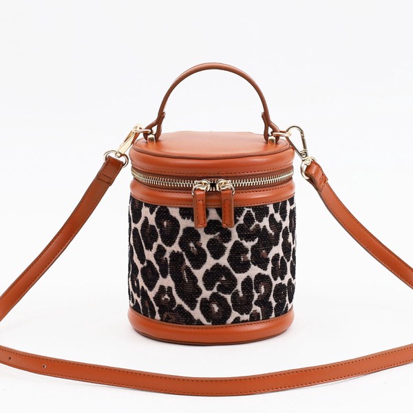 高級感あるヒョウ柄のジャカード生地を使用した筒型バニティバッグ!きれいな筒形なのでキレイ目スタイルにもピッタリベルト仕様のショルダーが付いているので斜めがけも◎二つ折り財布やスマホなど必要なものが入るサイズ感
