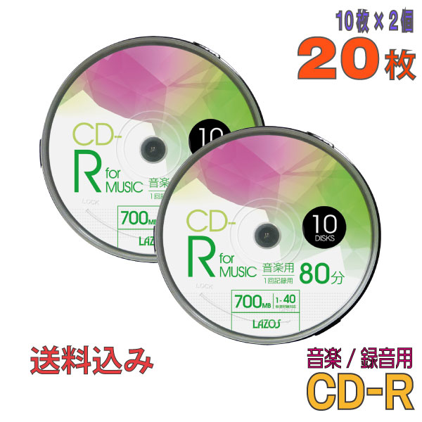 Lazos(ラソス) CD-R 音楽用 700MB 1-40倍速 「20枚(10枚×2個)」 (L-MCD10P 2個セット)
