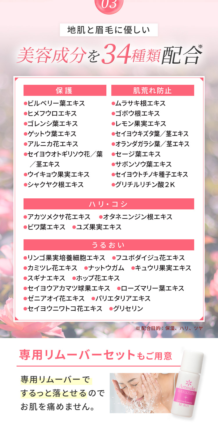 植物由来成分をしっかりと配合し、肌と眉毛へのいたわりを叶え、長時間つけても安心な使用感はそのままに。