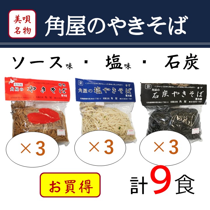 角屋のやきそば(袋入り焼きそば)ソース味・塩味・石炭×各3袋セット(計9袋(9食)) 【北海道美唄市】