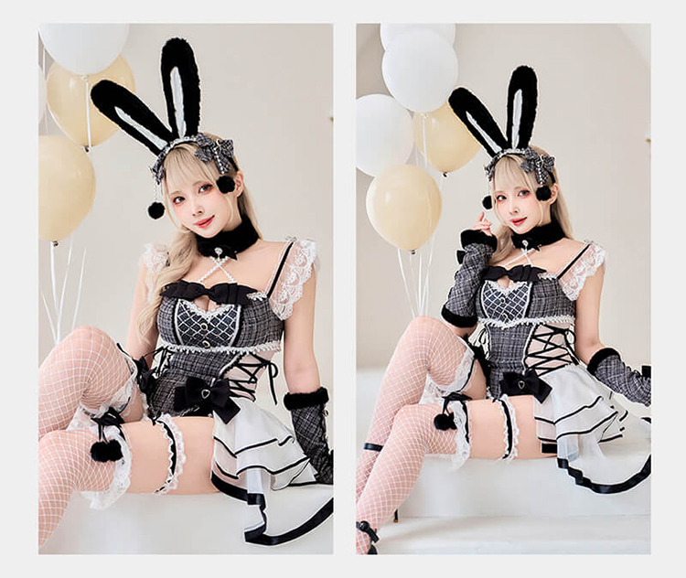 カチューシャ・髪飾り・ハイレグ・アームウォーマー・チュール・太もも飾り・ニーハイソックス・しっぽ