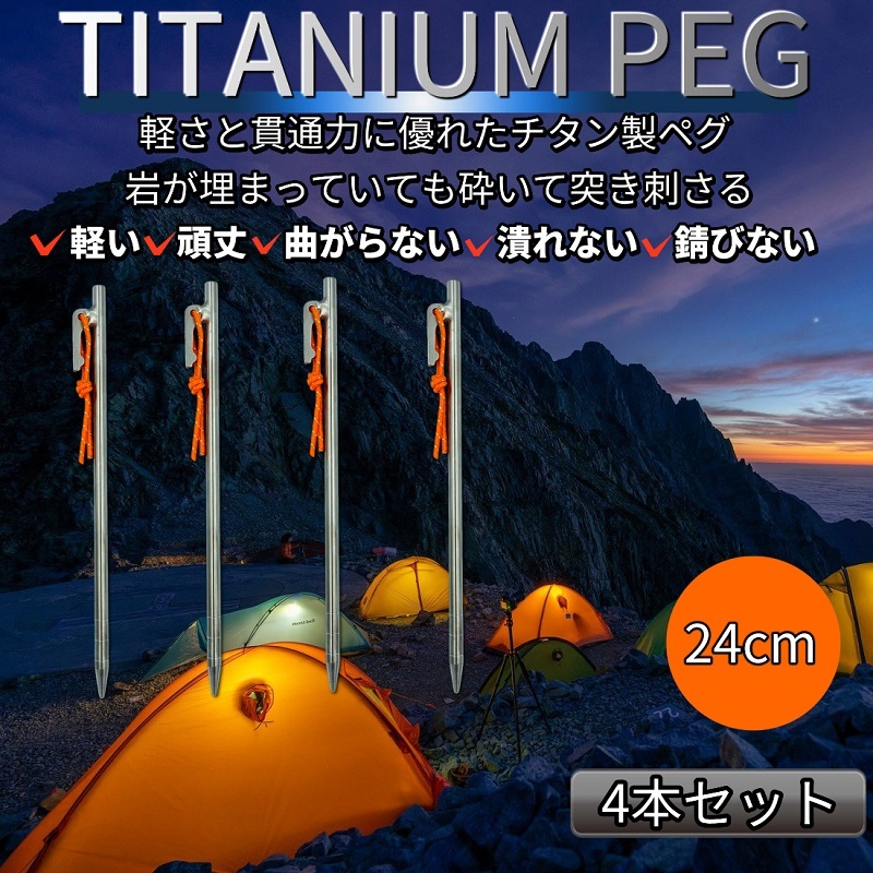 チタンペグ ペグ チタン テントペグ 24cm 4本セット テント タープ アウトドア キャンプ キャンプ用品 キャンプ用具 反射材ロープ付き 送料無料 最短翌日お届け