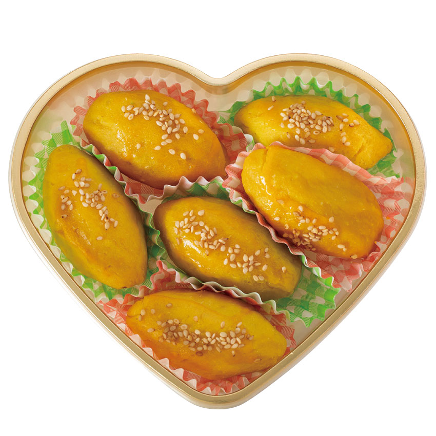 | 原材料 | さつまいも・卵黄・白ごま・豆乳 (1個当たり:約62kcal) たんぱく質1.3g・脂質2.0g・炭水化物7.0g・鉄0.7mg・カルシウム21mg マグネシウム11mg・ナトリウム2mg・ ビタミンC6mg・食物繊維0.9g |