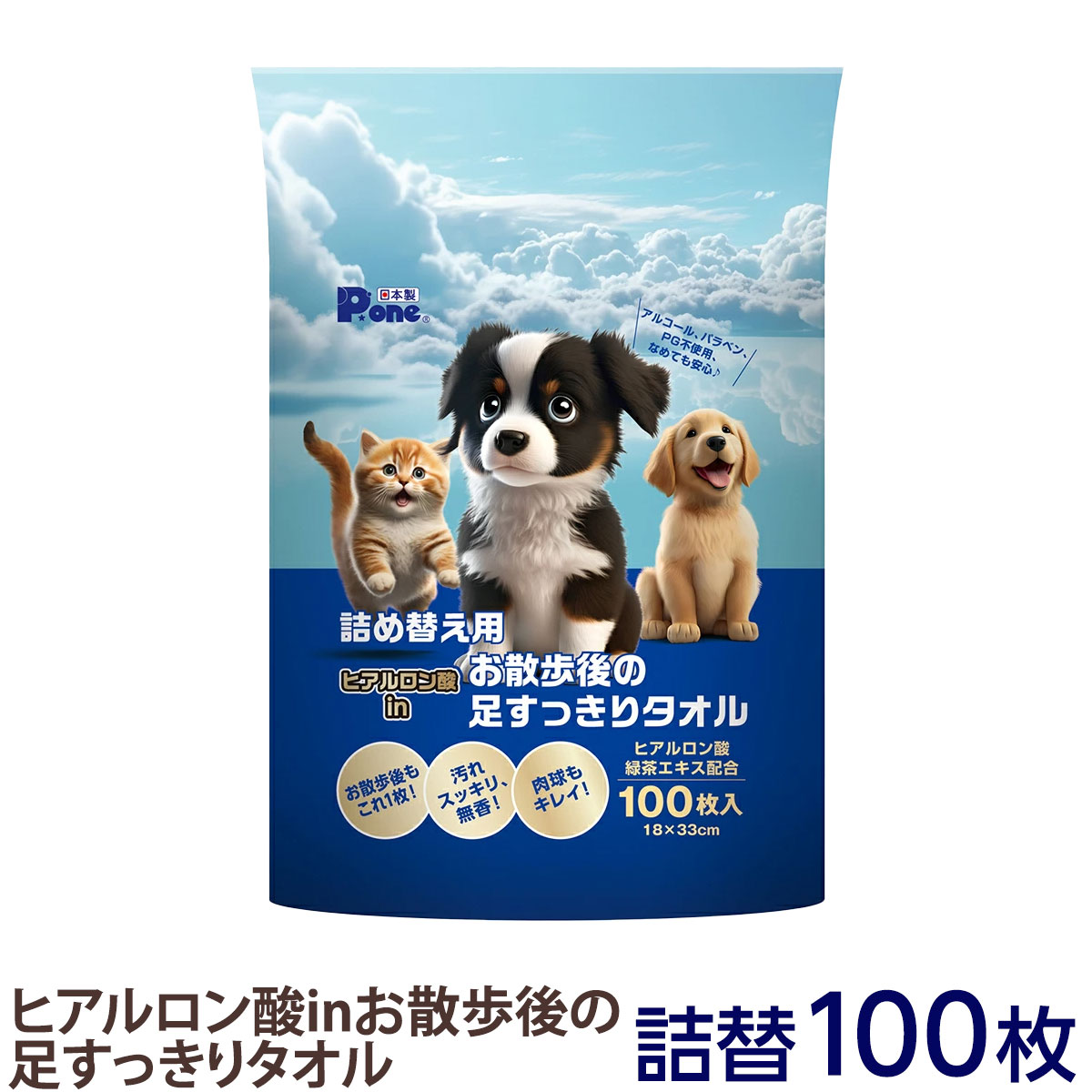 ピーワン P.one 第一衛材 ヒアルロン酸in お散歩後の足すっきりタオル 詰替 100枚 犬 猫 お手入れ 老犬 足裏 肉球 ボディタオル